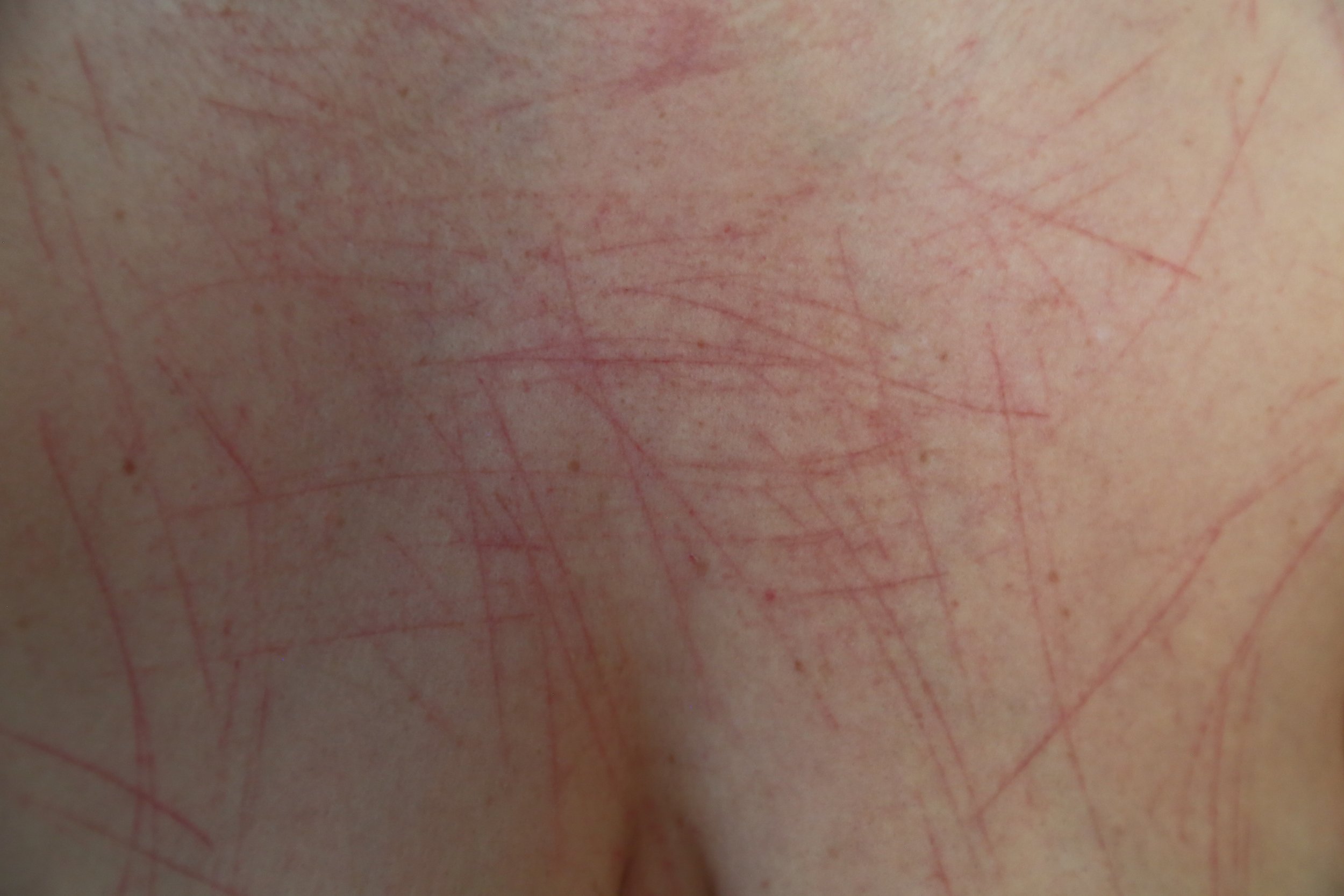 Dans Imprégner, je lave mon corps avec une éponge en fer utilisée pour nettoyer des tissus imprégnés de sang et d’organes. Le frottement blesse ma peau, qui devient elle-même support et réceptacle de cette mémoire organique. Ma sensibilité particulière (dermographisme) fait apparaître des tracés rouges et gonflés, que je photographie ensuite. Le corps devient alors une surface d’écriture, où l’empreinte se fait cicatrice et inscription éphémère.