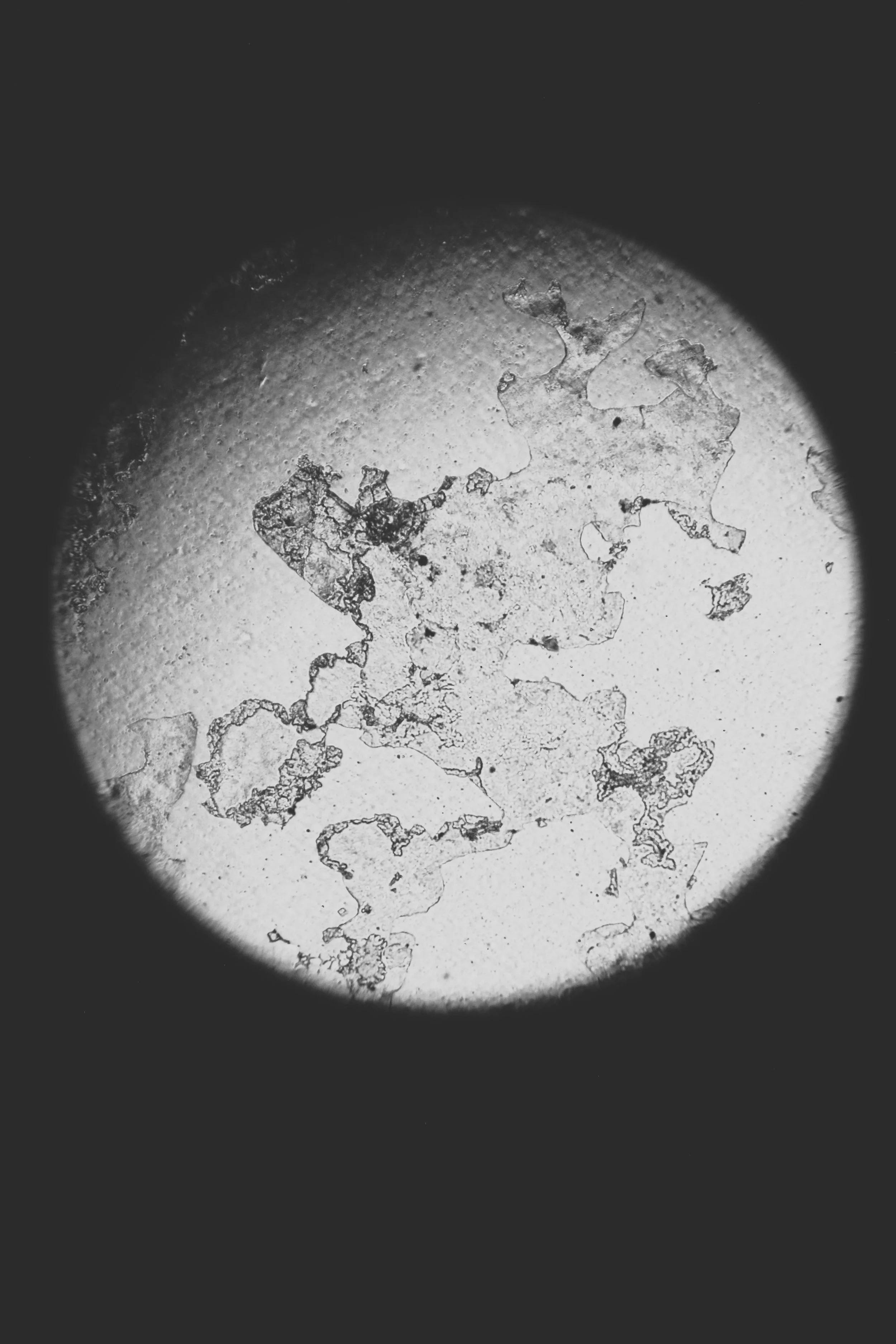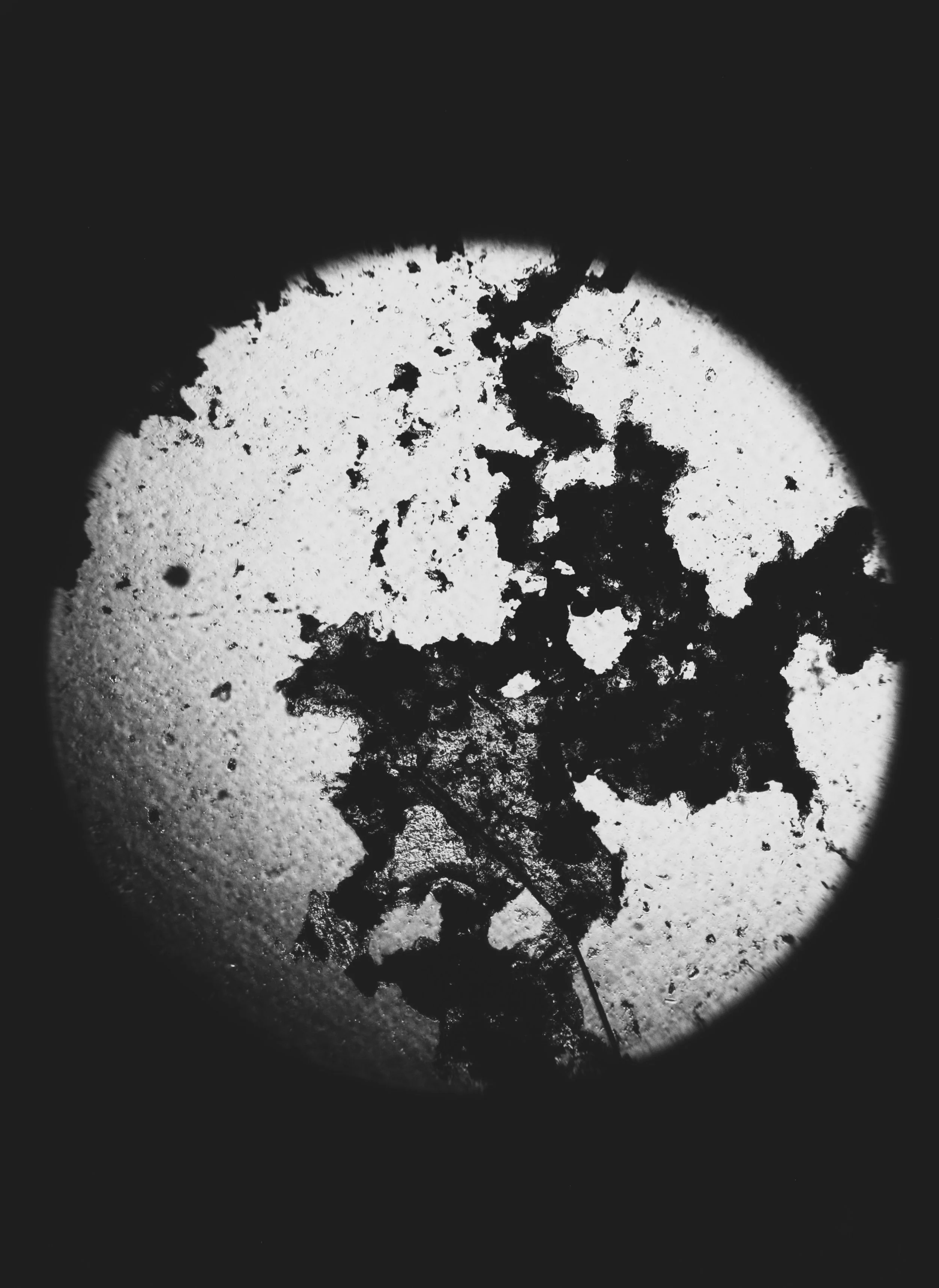 Dans Résidus, je cherche à réactiver la trace laissée par les organes. Après avoir lavé les tissus utilisés dans Empreintes, j’ai recueilli l’eau souillée et ses dépôts. Ceux-ci sont disposés sur des plaques transparentes, rappelant les lames de microscope, et observés à nouveau comme des formes vivantes. Malgré le lavage répété, l’empreinte persiste : une trace organique qui ne disparaît jamais totalement.
